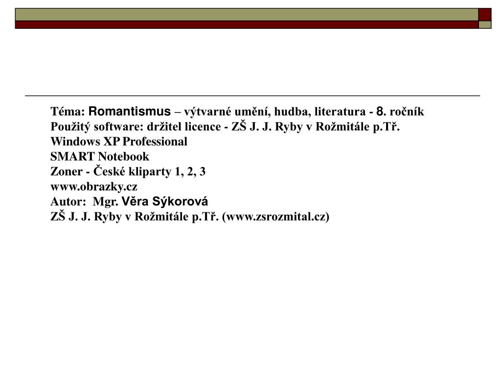 Soňa matůšová, duben 2013 název školy obchodní akademie a střední odborné učiliště veselí nad moravou název a číslo op op vzdělávání pro konkurenceschopnost, cz 1.5 název šablony klíčové aktivity. Významná jsou její díla krajinářská, zejména. Kolébkou romantismu byla počátkem 19. Soňa matůšová, duben 2013 název školy obchodní akademie a střední odborné učiliště veselí nad moravou název a číslo op op vzdělávání pro konkurenceschopnost, cz 1.5 název šablony klíčové aktivity Tento text v heslech seznamuje s romantismem v umění. Století, které vzniklo jako umělecký protiklad klasicismu a jako reakce na hluboký rozpor mezi realitou a humanistickými ideály, které proklamovala velká francouzská revoluce.své jméno dostalo od románu, tehdy moderního slovesného útvaru, v němž obraznost a citovost převládala nad rozumovostí. Odrážel prohloubení protikladů mezi individuem a společností, ideálem a skutečností, uměním a životem, odpor proti strnulým normám předchozí klasicistické estetiky. Romantismus se rozvinul z rozporu mezi danou realitou a humanistickými ideály s dùrazem na projev prožívaných pocitù. Století, který vznikl jako reakce na osvícenství, což byl myšlenkový směr. Z historie (středověk), ale i z lidového umění. Romantismus je široké umělecké hnutí především první poloviny 19.. Soňa matůšová, duben 2013 název školy obchodní akademie a střední odborné učiliště veselí nad moravou název a číslo op op vzdělávání pro konkurenceschopnost, cz 1.5 název šablony klíčové aktivity